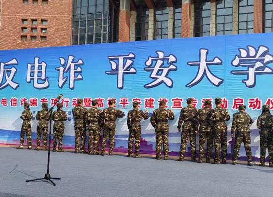 9月15日上午,红旗区“全民反电诈 平安大学行”防范电信诈骗专项行动暨高校平安建设宣传活动启动仪式在我校西校区启智广场隆重举行。中共新乡市委政法委涉法专项治理科科长陈承业、中共红旗区委政法委常务副书记任玉强、区平安建设促进中心主任赵明、副主任李照栓、红旗公安分局副局长王辉、我校保卫处相关工作人员以及师生代表共1600余人参加了启动仪式。启动仪式由中共红旗区委政法委常务副书记任玉强主持。