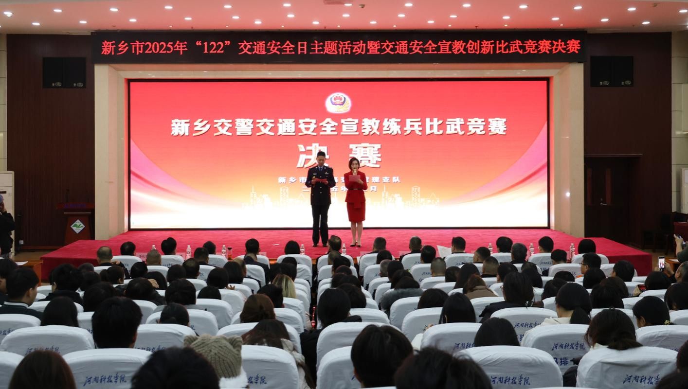 12月2日下午,由新乡市公安局等八部门主办、我校协办的2025年“122”交通安全日主题活动暨交通安全宣教创新比武竞赛决赛,在行政楼308报告厅隆重举行。活动以“文明交通 礼行天下”为主题,通过文艺展演与安全教育深度融合的形式,为300余名师生带来一堂生动深刻的交通安全实践课。